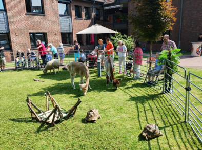 Diesen hatten Frau Claudia Müller und Judith Pössel gemeinsam mit ihrem Team für die Bewohnerschaft des Hauses organisiert. Laut Frau Müller kam der rollende Zoo bei den Bewohnern und Mitarbeitende sehr gut an. Das ganze fand bei strahlendem Sonnenschein statt. Die Tiere konnten von der Bewohnerschaft gestreichelt werden. Zum Mittag gab es Hot Dogs. Dann wurden spontan die Kinder der angrenzenden Kita eingeladen. Diese kamen in Kleingruppen und konnten sich gemeinsam mit der Bewohnerschaft des Hauses die Tiere von dem Zoodirektor erklären lassen. Zum Nachmittag wurde noch der Eiswagen bestellt. Alles in allem war es ein rundum gelungener Tag. Einige Bewohner/innen fragte auch, wann der rollende Zoo wieder kommt.